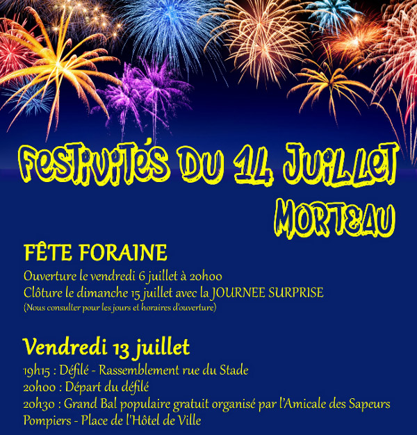 Le SCVM donne rendez-vous le 13 juillet à tous ceux et celles qui ont envie de participer au défilé. Il partira à 19h15 de la rue du Stade de Morteau pour rallier l’Hôtel de Ville vers 21h00, comme l’année précédente des tickets de manège seront distribués aux enfants présents.